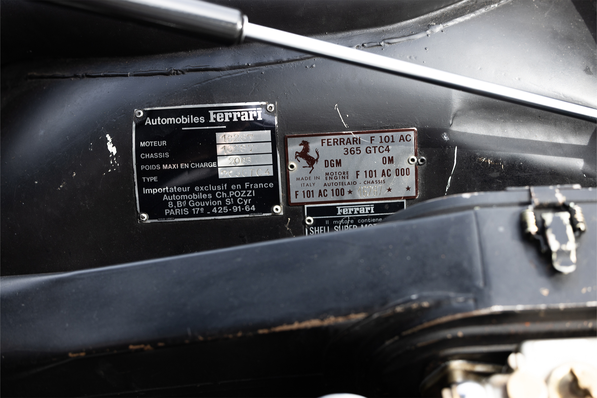 This is the second to last produced Ferrari 365 GTC/4. Chassisnumber 16287 and 16289 were both destined for French Ferrari imported Ch Pozzi. According to research done by French Ferrari historian Marc Rabineau, the car had four different owners in France, before it was exported to Belgium.