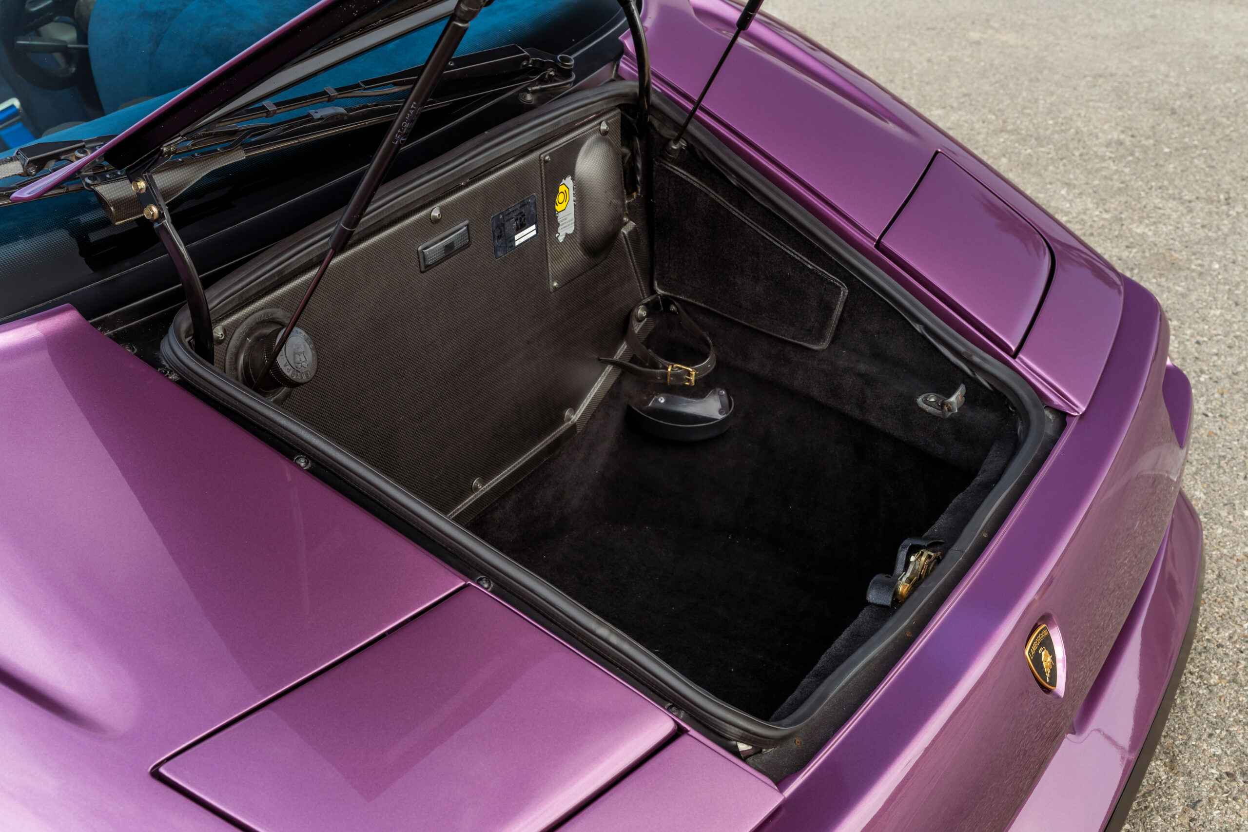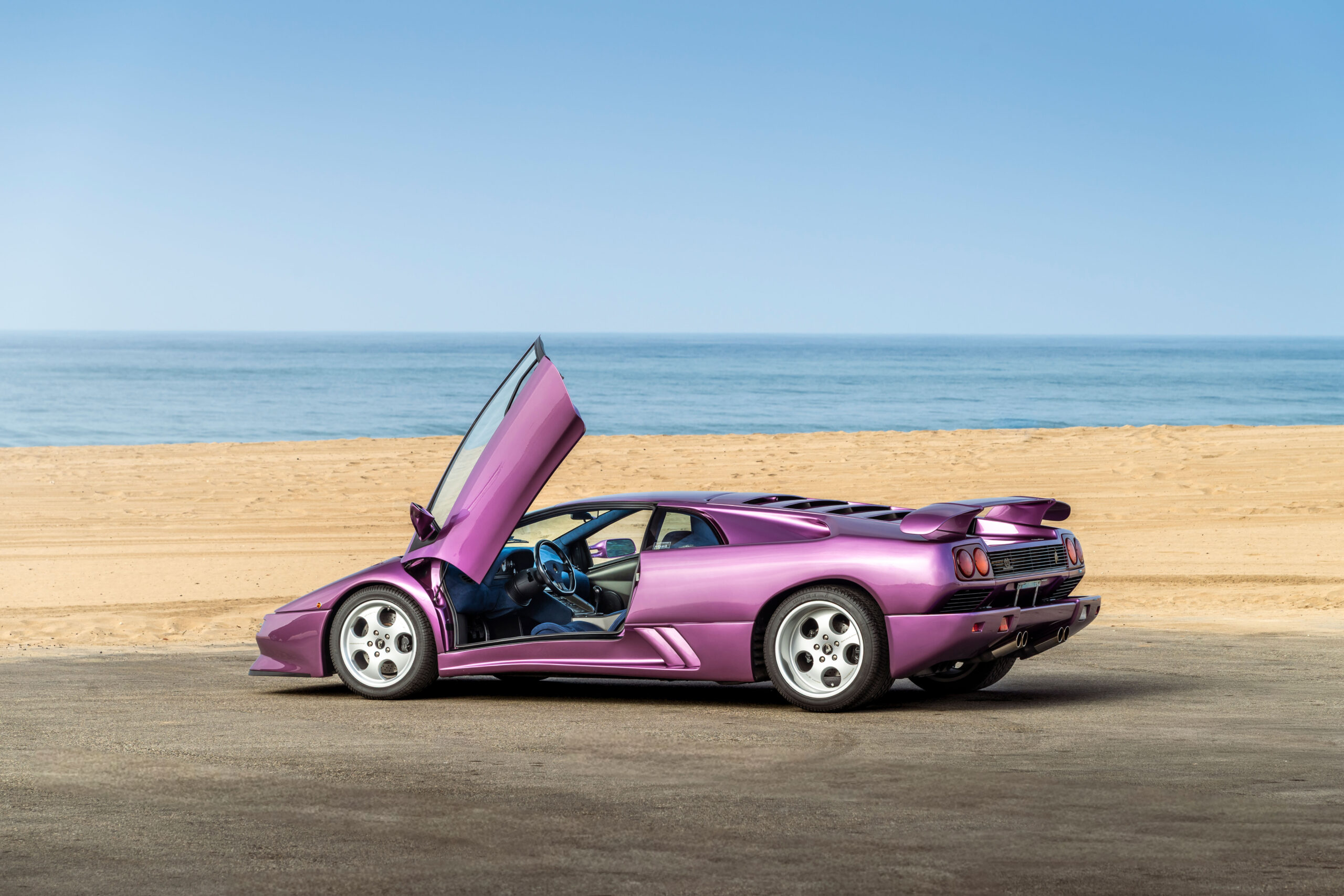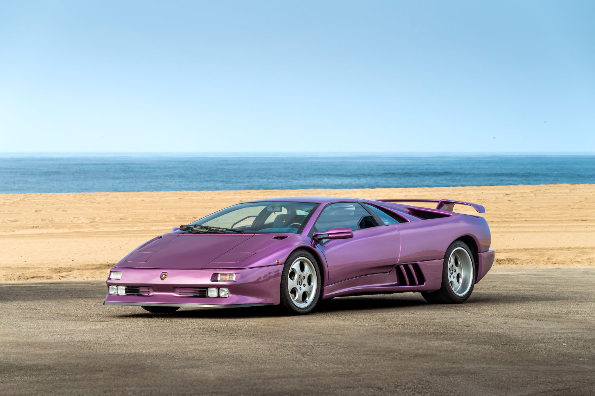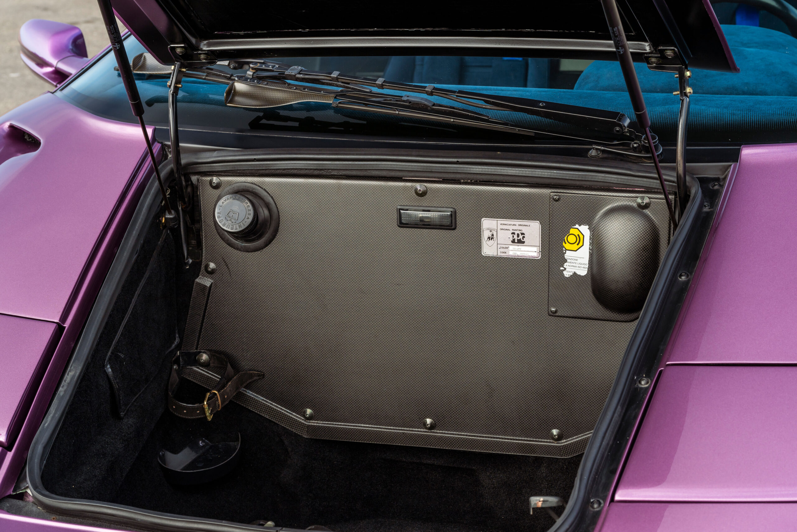 Still sporting its original color combination of Viola SE30 over a Blu Alcantara, the Diablo has seen a resurgence in recent years, beloved by enthusiasts for their sheer character and panache, with the SE30 being particularly sought after for its added performance over its predecessors. This SE30 has been largely kept in static storage and presents very well throughout, having been driven approximately 1,200 km over the past twelve years, with the odometer showing 12,840 km at the time of cataloguing, which is believed to be original. It would make an exciting addition to any collection of Lamborghinis, perfectly bridging the gap between the current cars produced under Audi AG’s ownership today and the Miura and Countach.