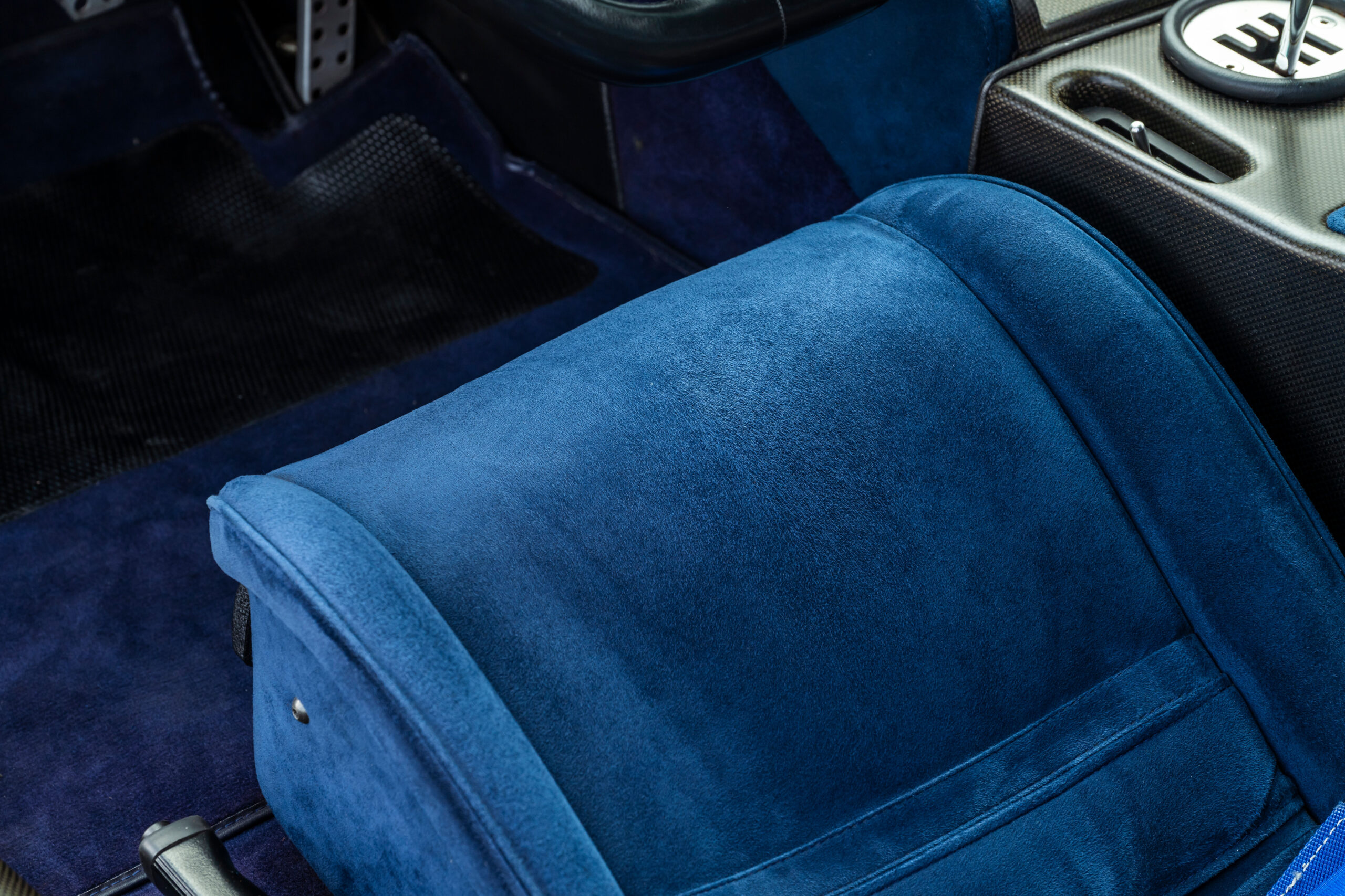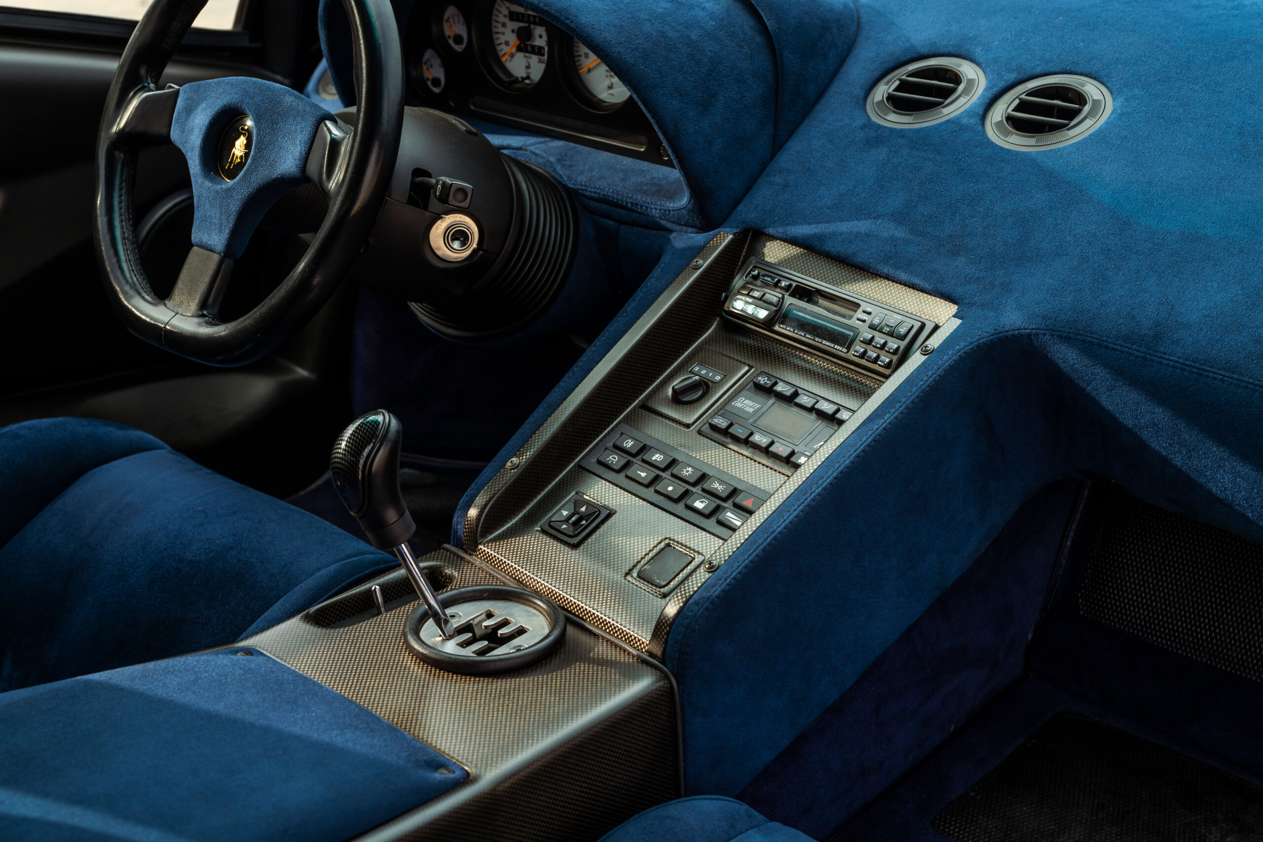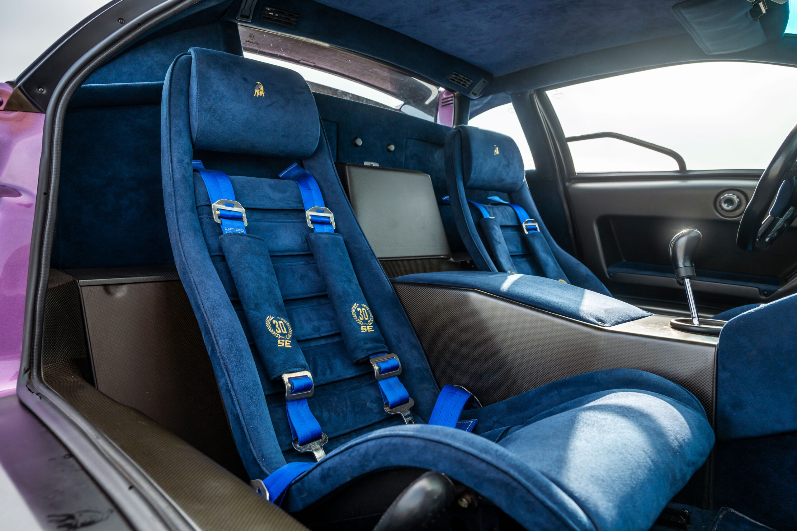Tipping the scales at about 3,150 pounds, the Diablo SE30 benefited from a savings of more than 300 pounds over the standard rear-wheel drive Diablo and nearly 400 pounds over the all-wheel drive VT. Lamborghini also eliminated creature comforts such as air conditioning, power steering, the Alpine audio system, and the multi-adjustable leather seats. Purposeful carbon fiber seats fitted with four-point racing harnesses held the driver and passenger in place. Even the power windows were removed in favor of fixed plexiglass units with a sliding vent window.