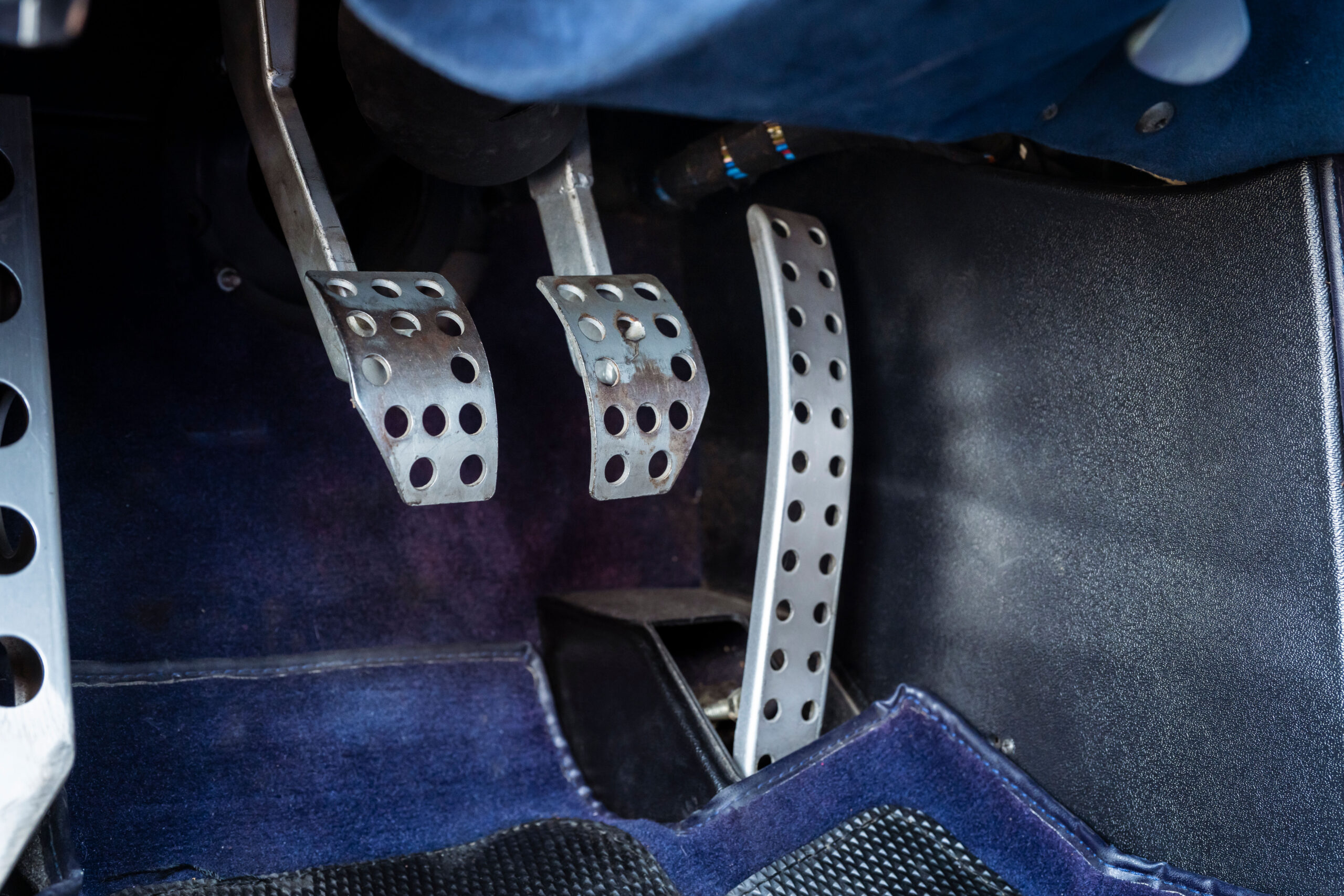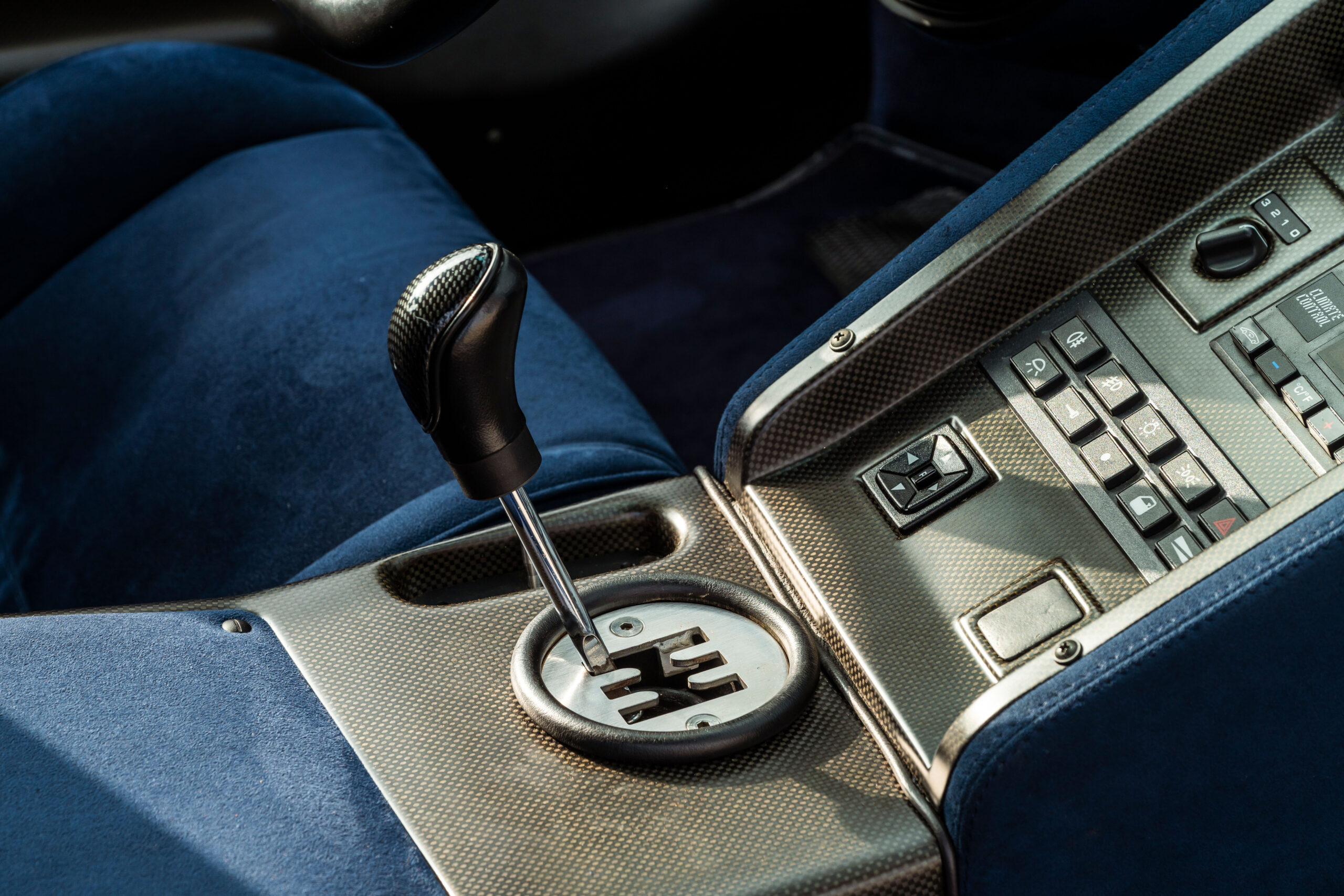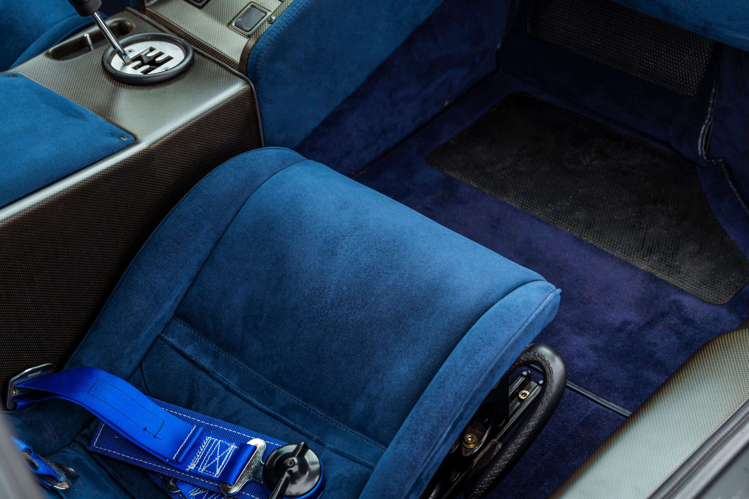 Tipping the scales at about 3,150 pounds, the Diablo SE30 benefited from a savings of more than 300 pounds over the standard rear-wheel drive Diablo and nearly 400 pounds over the all-wheel drive VT. Lamborghini also eliminated creature comforts such as air conditioning, power steering, the Alpine audio system, and the multi-adjustable leather seats. Purposeful carbon fiber seats fitted with four-point racing harnesses held the driver and passenger in place. Even the power windows were removed in favor of fixed plexiglass units with a sliding vent window.