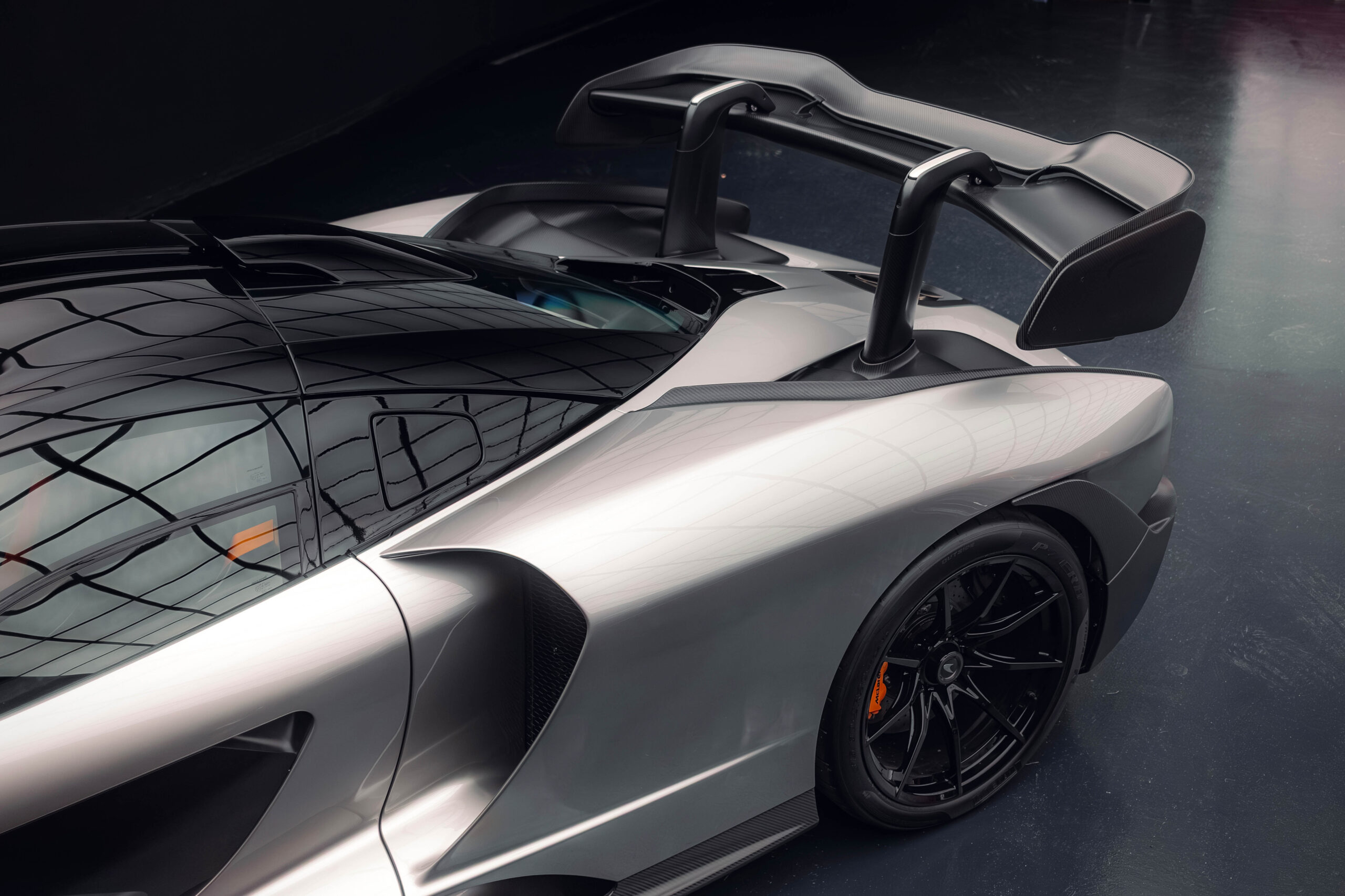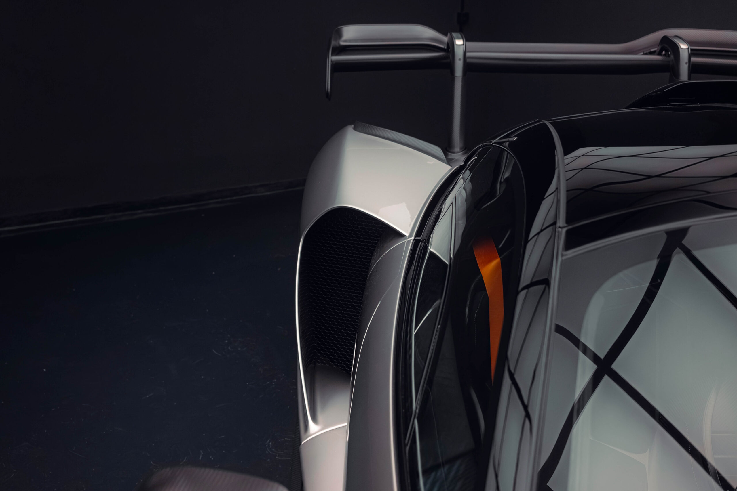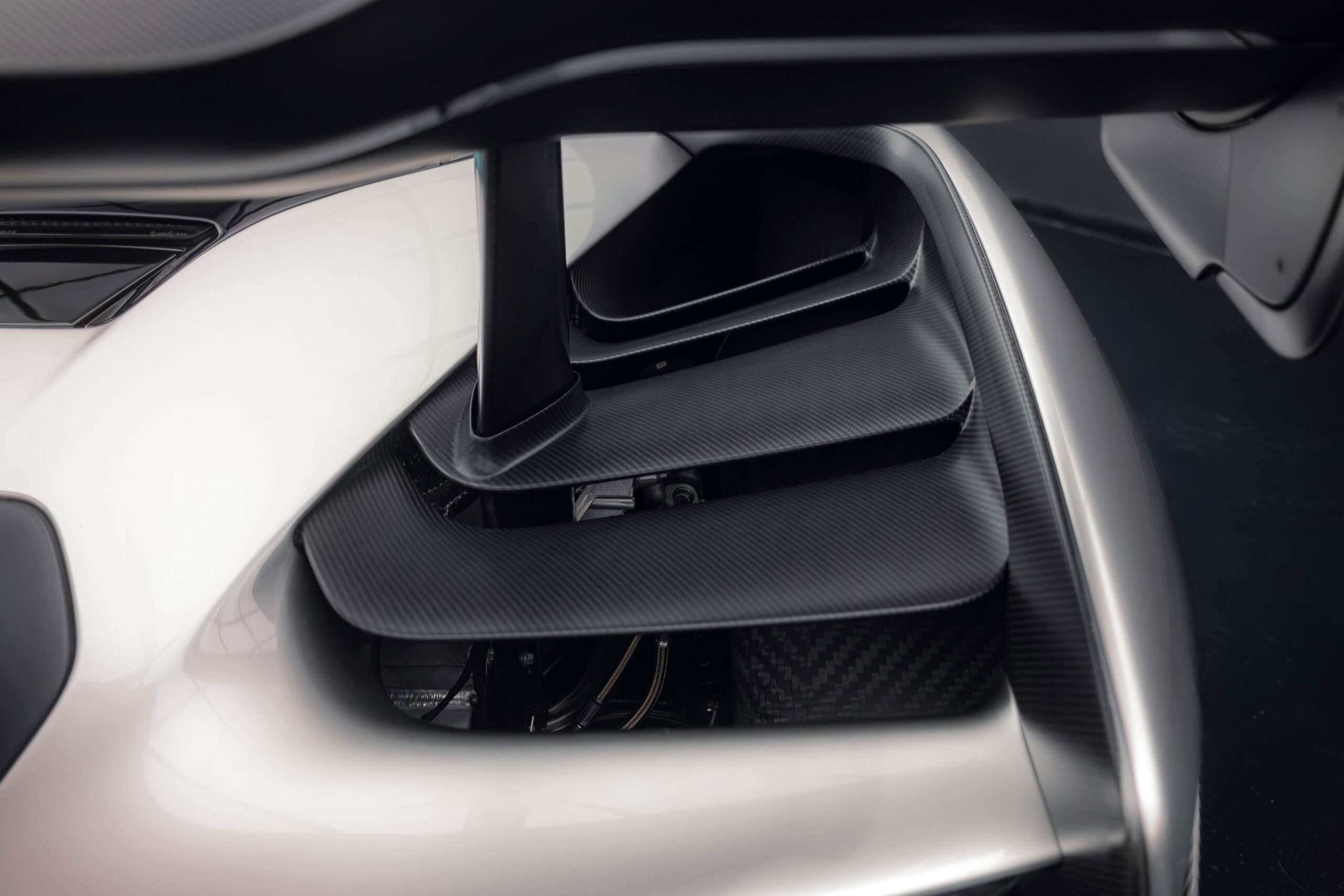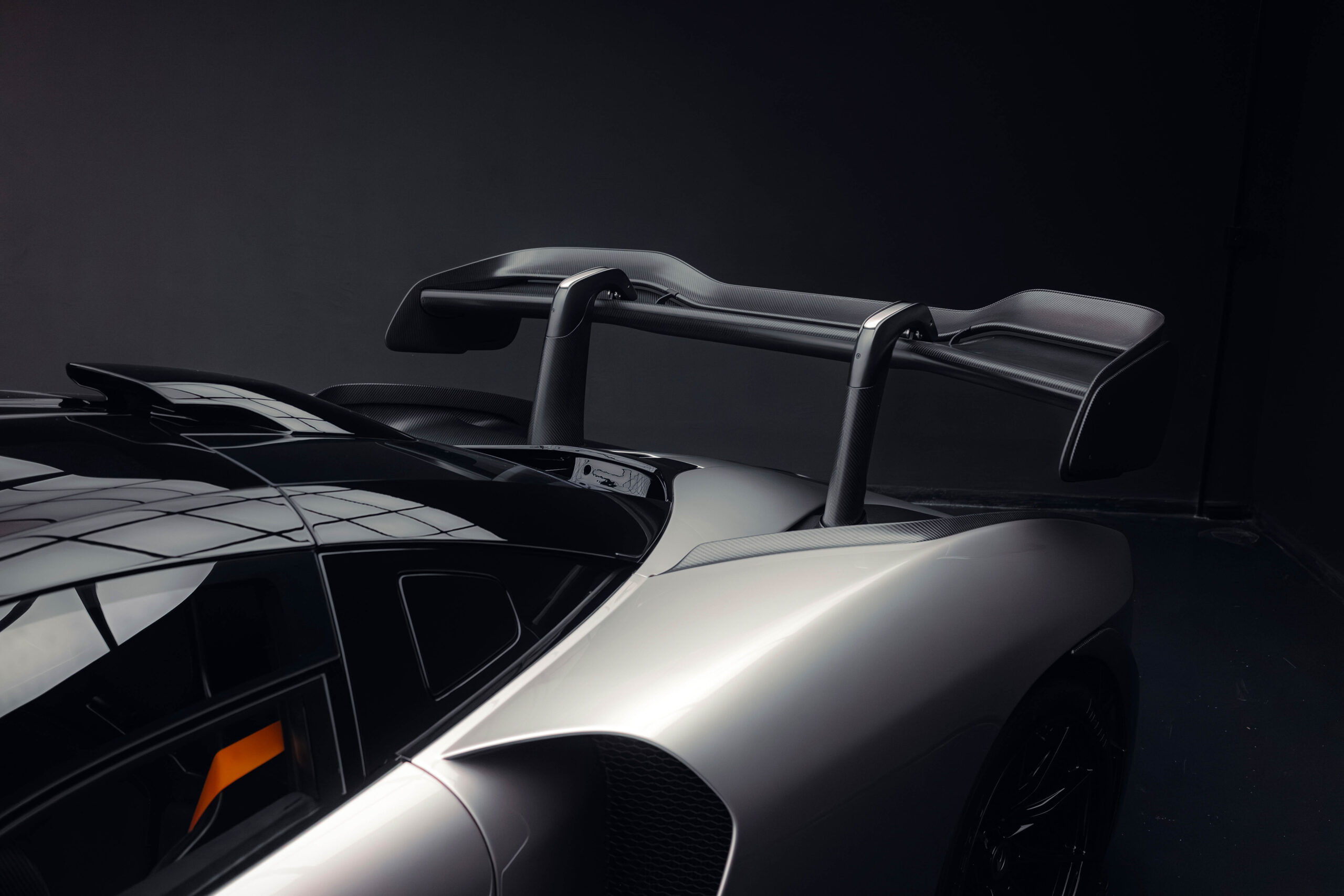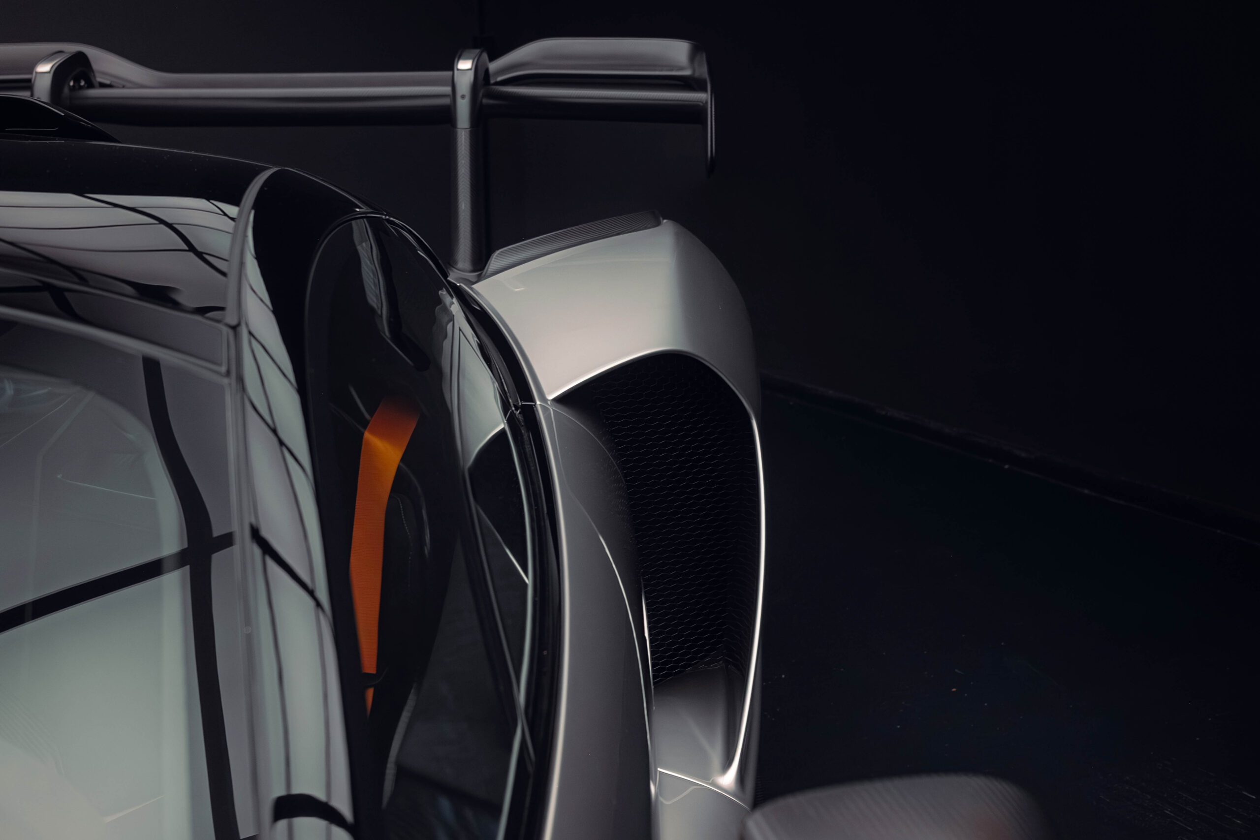 The Senna’s rear wing was arguably its most striking feature, heralding the car’s exceptional active aerodynamics. A substantial raised splitter and dynamic winglets at the front direct airflow under the body, while warm air from the radiators is funneled over the roof and channeled across that enormous active rear wing. Hydraulically controlled, this wing continuously adjusts to optimize downforce, function as an air brake, or minimize drag. At 250 km/h, the Senna generates up to 800 kilograms of downforce, a 40 percent improvement over the P1.