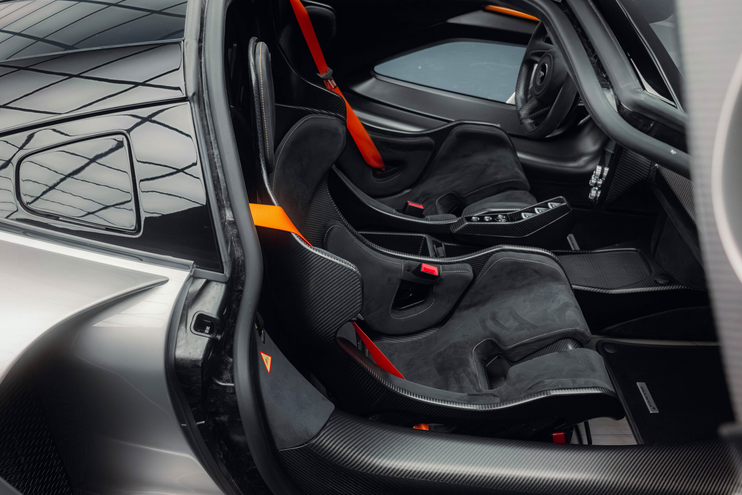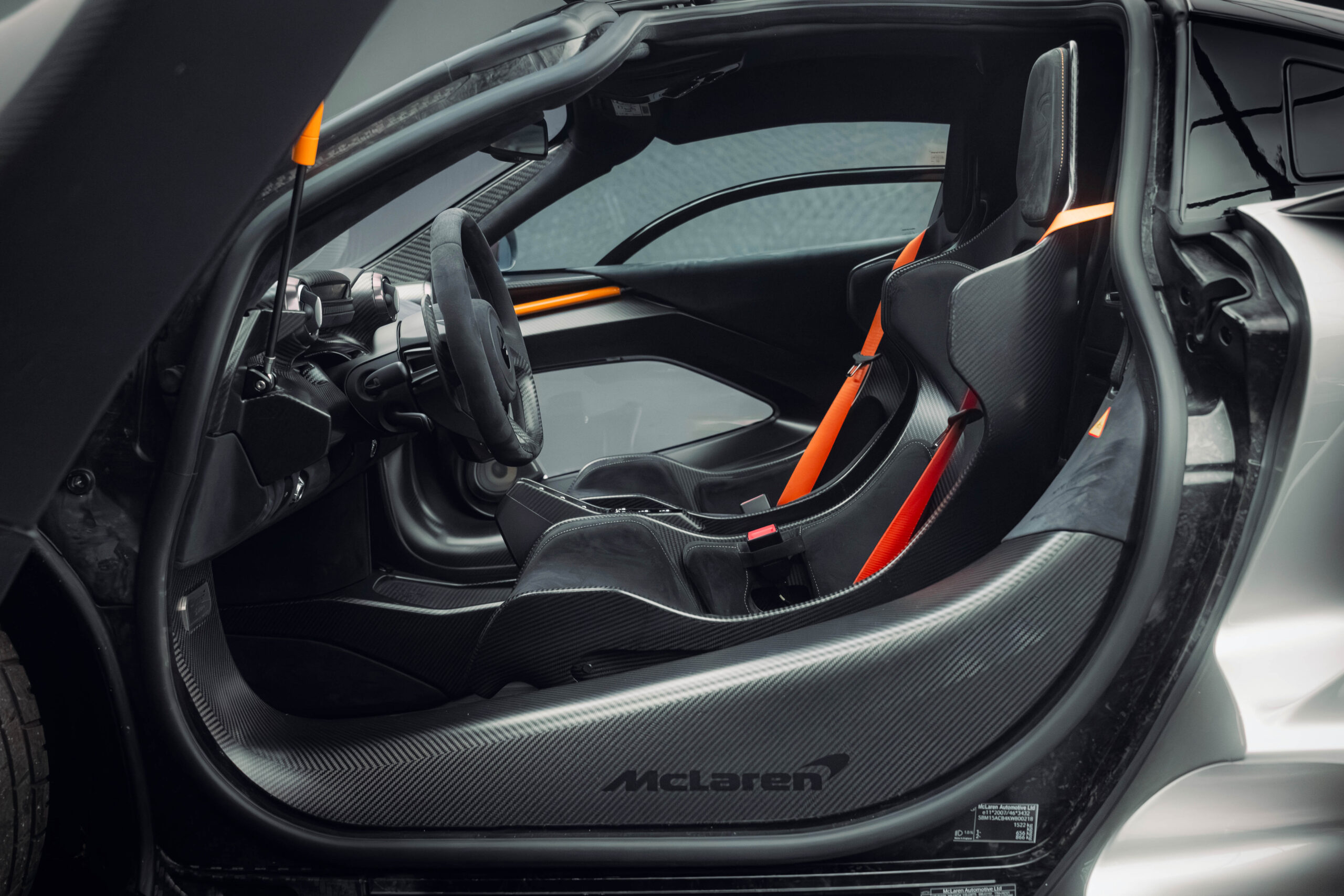 Purchased new by the consignor in September of 2018 via McLaren Geneva, this Senna is the 218th example constructed of just 500 built. Its stunning paintwork, called Liquid Alloy Silver, is a shade offered exclusively via McLaren Special Operations and seldom seen on any Senna due to its extreme cost and complexity. The wheels are finished in black alongside McLaren Orange brake calipers, while the interior is trimmed in Carbon Black Alcantara with McLaren Orange stitching and seat belts, providing a contrasting touch. In early 2019, the car was covered in full paint protection film in an effort to preserve its spectacular paintwork. Invoices on file show that the car has been serviced at McLaren Geneva, with the third- and fourth-year services carried out in February 2023 and the fifth-year service carried out in October 2024.