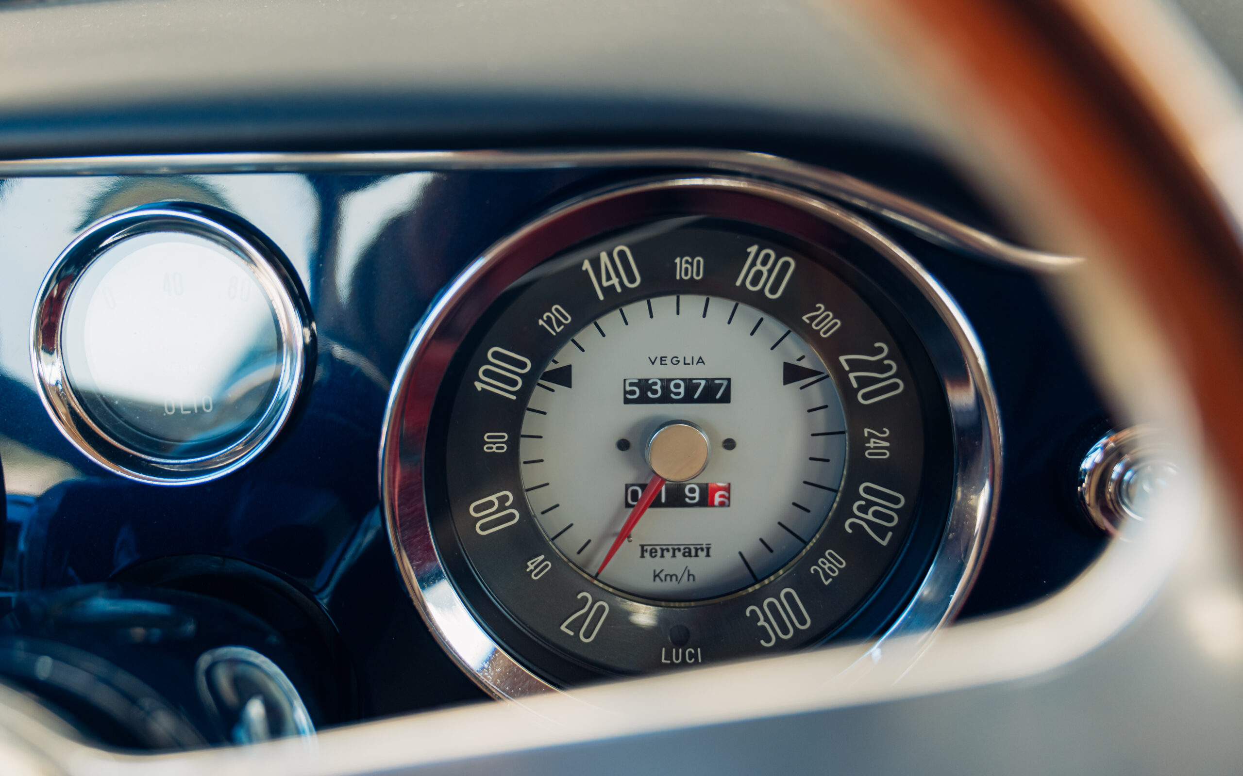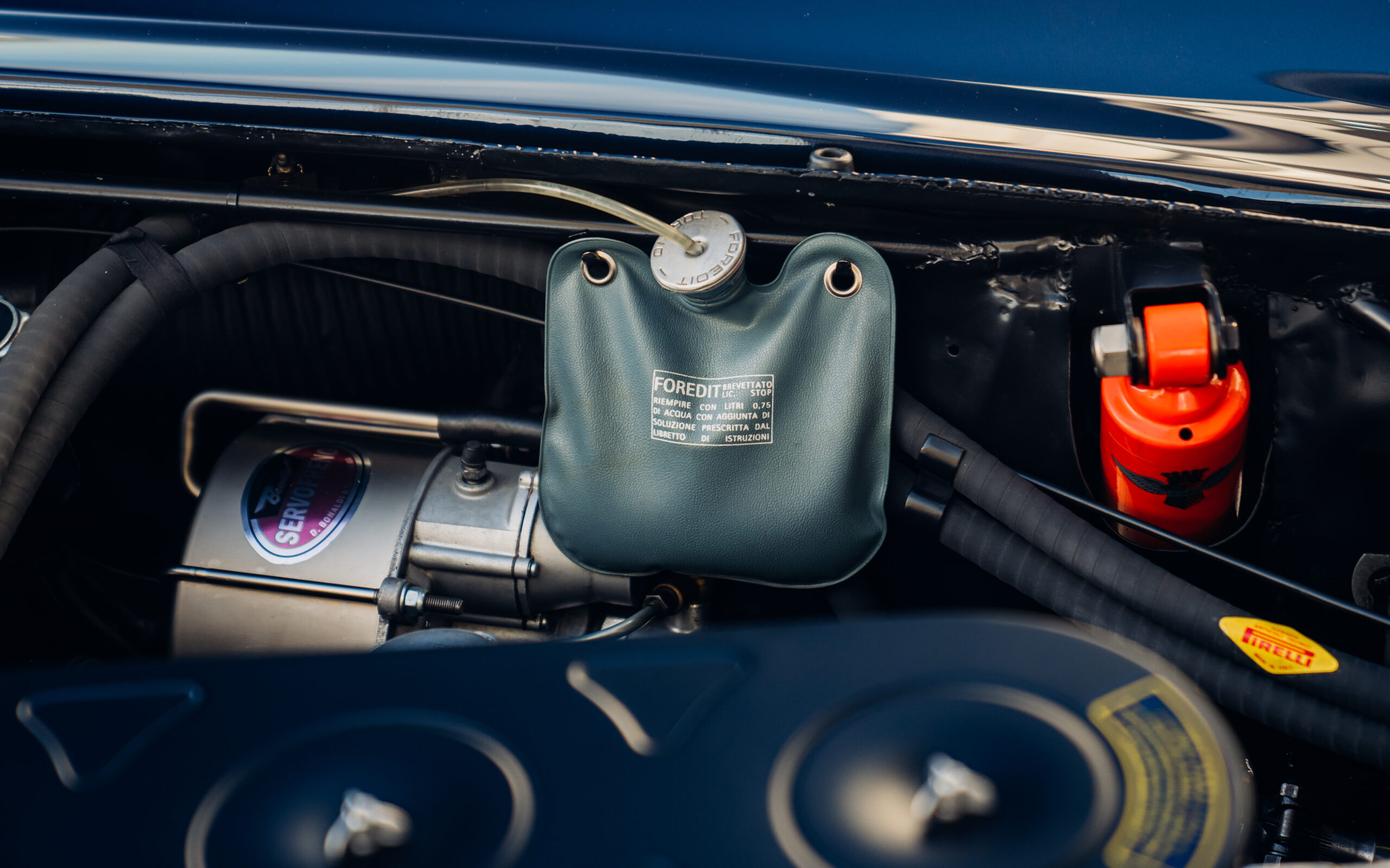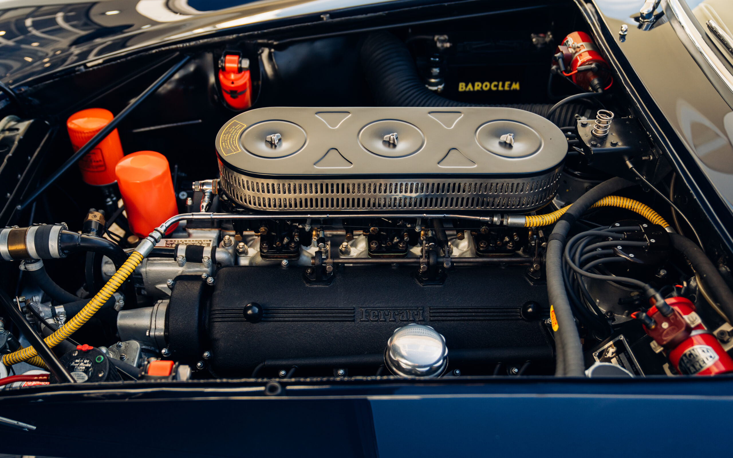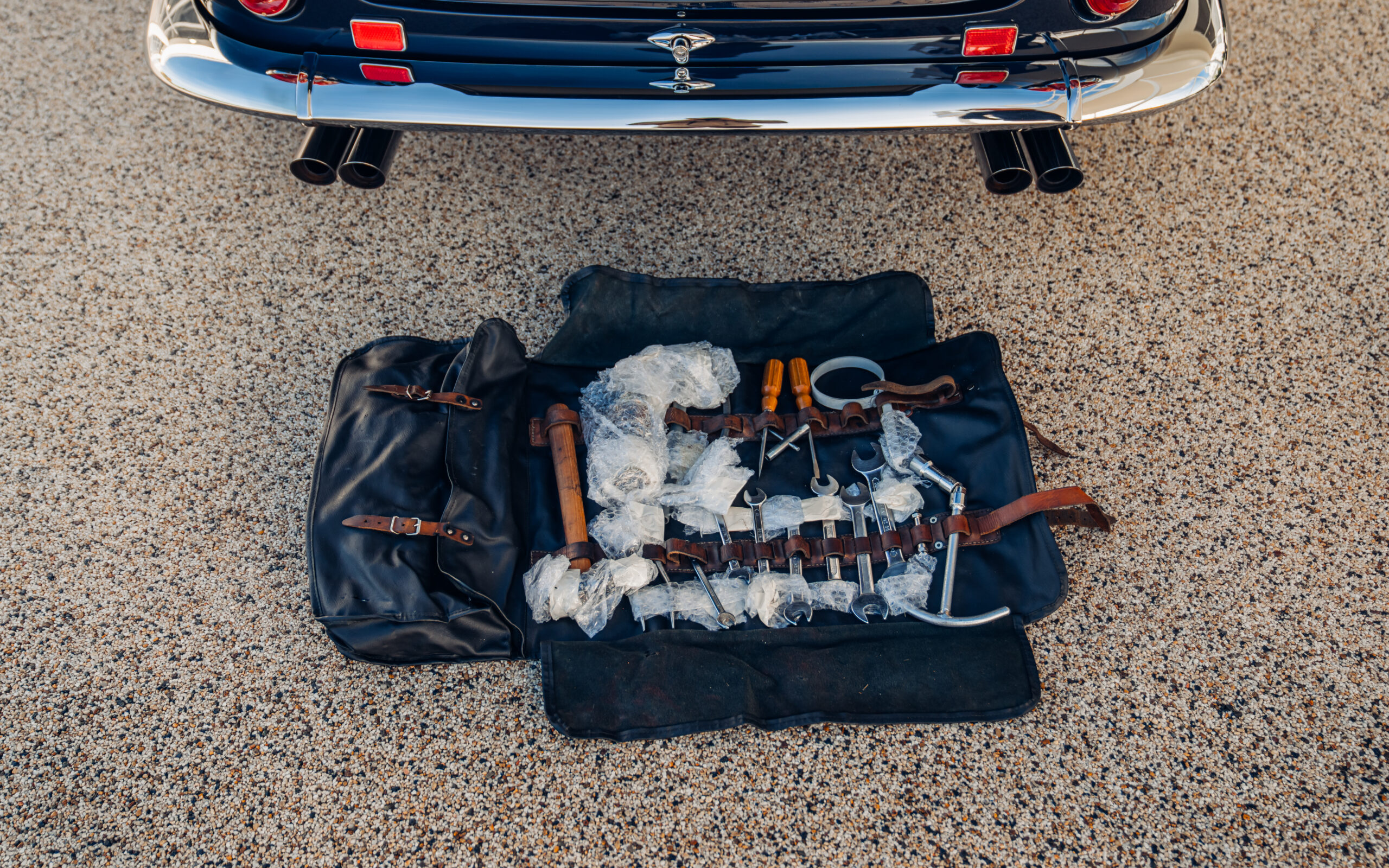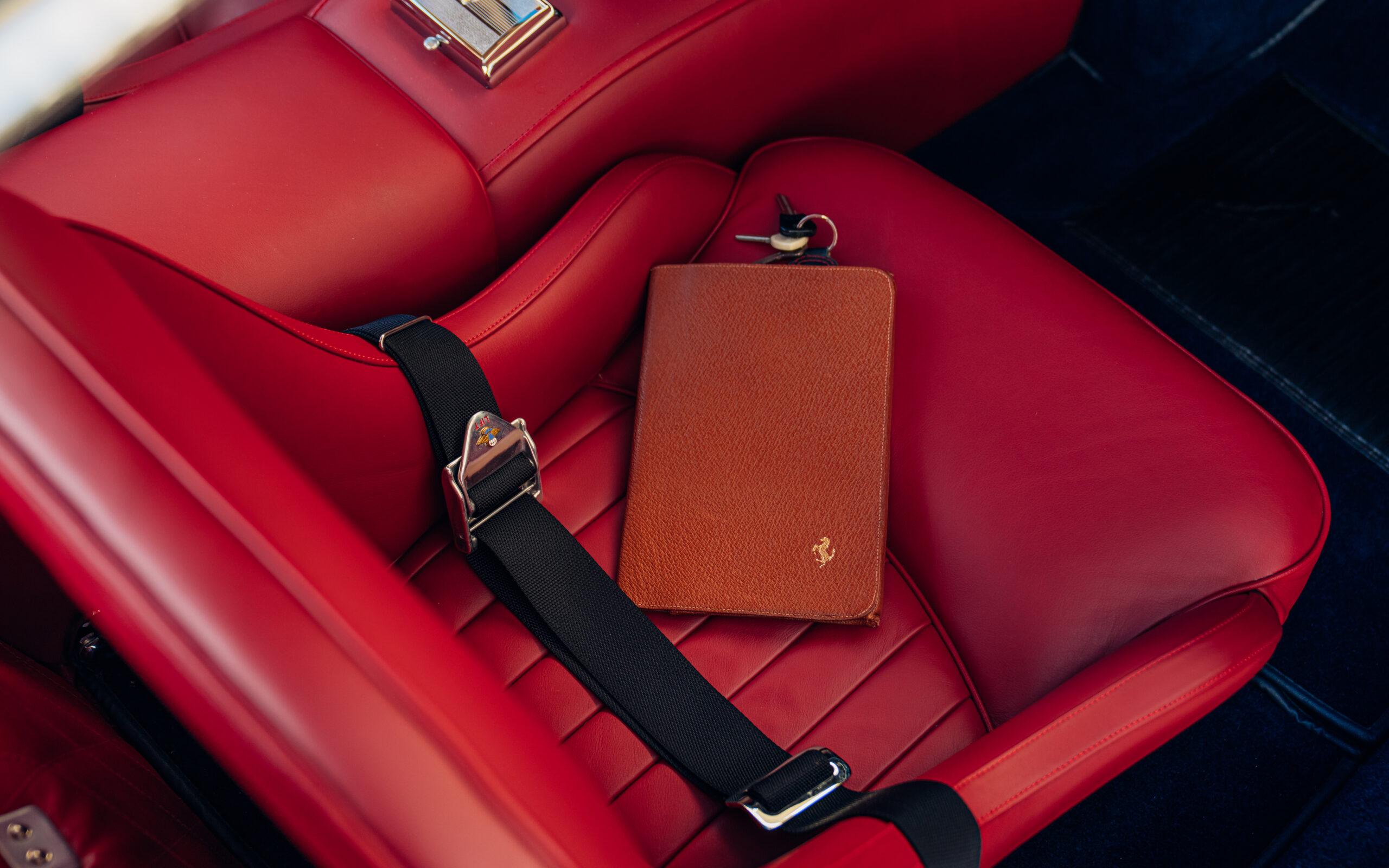 Most recently exhibited at the exclusive Concours of Elegance at Hampton Court in 2019, 3367 GT has since been featured in the August/ September 2019 edition of Cavallino magazine and has continued to be enjoyed privately by its owner. As if to underline his continued commitment to exacting maintenance, it has recently benefitted from the fitment of a new exhaust, a comprehensive brake overhaul and a further gearbox rebuild by Bob Houghton, while a further ‘refurbishment’ respray in Blu Notte Metallizzato was undertaken in May 2024 by highly regarded expert Ross Packard Paintwork. So exacting are this owner’s standards and attention to detail that the car has a special pair of fully bespoke seat covers, so that no wear or discolouration can affect the Connolly hides of the seats. The owner has also furnished the car with two sets of period-correct Borrani wheels; a slightly wider ‘driving’ set shod with Avon tyres, and the car’s (standard specification) show wheels (which wear correct-type Pirelli Cinturato rubber) and are in concours-ready condition. Each set even has their own respective set of spinners allocated to suit.
